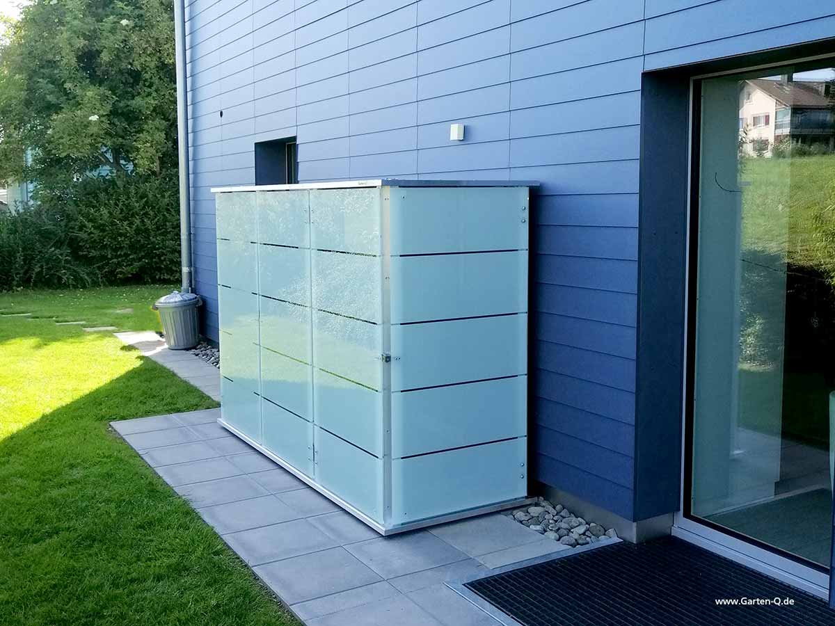 Variantenreich gibt es diesen modernen Gartenschrank mit ein- bis dreiseitigem Zugriff. Auf Wunsch erhalten Sie auch ein Dachbegrünungsmodul.