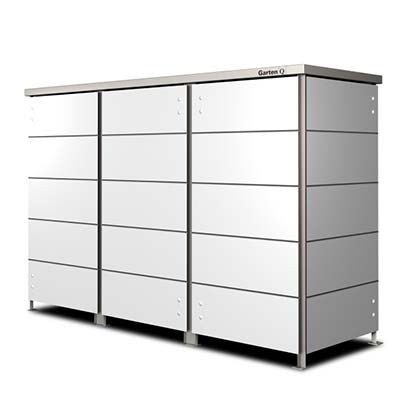 Drei Mülltonnen verstauen Sie im Garten[Q]Trash-3. Größe: 2,34 m x 0,82 m x 1,58 m oder 1,20 m (B x T x H). Sie können auch nur zwei Mülltonnen und eine integrierte Paketbox mit praktischen Regal für weitere Dinge unterbringen.
